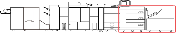 En esta sección se describe cómo eliminar un atasco de papel ocurrido en el Depósito de Papel Multibandeja D y secciones de alimentación de papel relevantes. Las posiciones del Depósito de Papel Multibandeja D y de las secciones de alimentación de papel relevantes se indican en la ilustración siguiente.