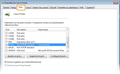 1 | Sélectionnez le numéro de port à supprimer et cliquez sur [Supprimer le port]. ![]() ![]() Vous ne pouvez pas supprimer un port configuré en tant que port de l'imprimante. Pour supprimer ce port, sélectionnez un autre port et cliquez sur [Appliquer] pour le configurer en tant que nouveau port de l'imprimante, puis supprimez le port d'origine. |