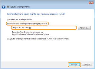 Sélectionnez [Sélectionner une imprimante partagée par nom], saisissez une destination de connexion, et cliquez sur [Suivant].