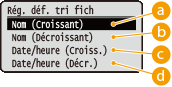 ()  <Régl. impression USB>    <Rég. déf. tri fich>    Sélectionnez le critère définissant l'ordre d'affichage des fichiers
