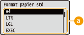 ![]() | Les réglages relatifs à l'alimentation papier et au format du papier chargé dans l'appareil sont répertoriés et accompagnés d'une brève description. Lorsque vous appuyez sur ( ) sur le panneau de commande, le menu Sélectionnez l'alimentation s'affiche. Les réglages par défaut sont signalés par une croix ( ). |