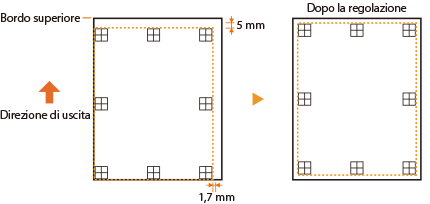 . Stabilire la direzione e la distanza da regolare sulla base di tali contrassegni. Quando la posizione di stampa è normale, tutti i contrassegni vengono stampati in una posizione distante 5 mm dal bordo più vicino della carta.