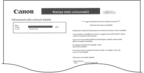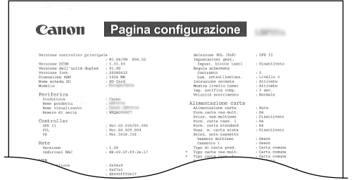 Menu Configurazione), i contenuti registrati nella macchina e altre informazioni, in formato elenco. Le altre informazioni includono la quantità di toner restante, il numero di pagine stampate e la capacità della memoria (RAM) installata nella macchina. Le voci di impostazione il cui nome è preceduto da un asterisco (