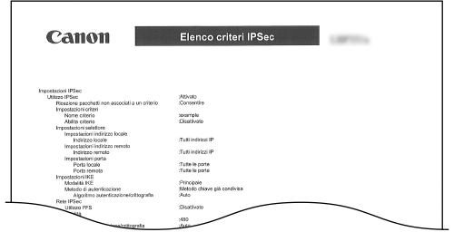 È possibile controllare l'elenco dei nomi dei criteri e le impostazioni IPSec registrate nella macchina stampando un Elenco criteri IPSec.