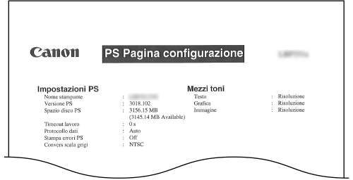Vengono stampate in formato elenco le impostazioni per usare la modalità PS e le informazioni interne registrate nella macchina.