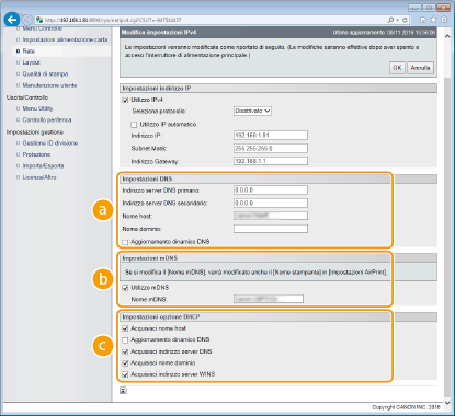 2 | Configurare le impostazioni DNS IPv4. ![]() [Impostazioni DNS][Indirizzo server DNS primario] Digitare l'indirizzo IP di un server DNS. È possibile impostare l'indirizzo IP anche dal pannello operativo (Impostazioni IPv4). [Indirizzo server DNS secondario] Digitare l'indirizzo IP di un server DNS secondario. È possibile impostare l'indirizzo IP anche dal pannello operativo (Impostazioni IPv4). [Nome host] Immettere dei caratteri alfanumerici per il nome host della macchina da registrare sul server DNS. [Nome dominio] Immettere dei caratteri alfanumerici per il nome del dominio a cui appartiene la macchina, come "esempio.com". [Aggiornamento dinamico DNS] Selezionare la casella di controllo per aggiornare dinamicamente i record DNS quando viene modificato l'indirizzo IP della macchina. [Impostazioni mDNS][Utilizzo mDNS] Adottato da Bonjour, mDNS (multicast DNS) è un protocollo per associare un nome host a un indirizzo IP senza utilizzare DNS. Selezionare la casella di controllo per abilitare mDNS e immettere il nome mDNS nella casella di testo [Nome mDNS]. Questa casella di controllo può essere selezionata solo quando la casella di controllo [Utilizzo IPv4] è selezionata. [Impostazioni opzione DHCP][Acquisisci nome host] Selezionare la casella di controllo per abilitare Opzione 12 e ottenere il nome host dal server DHCP. Per specificare se ottenere un nome host si può anche usare il pannello operativo (Impostazioni IPv4). [Aggiornamento dinamico DNS] Selezionare la casella di controllo per abilitare Opzione 81 e aggiornare dinamicamente i record DNS attraverso il server DHCP. Per specificare se eseguire l'aggiornamento dinamico DNS si può anche usare il pannello operativo (Impostazioni IPv4). [Acquisisci indirizzo server DNS] Selezionare la casella di controllo per abilitare l'Opzione 6 e ottenere l'indirizzo del server DNS dal server DHCP. [Acquisisci nome dominio] Selezionare la casella di controllo per abilitare Opzione 15 e ottenere un nome di dominio dal server DHCP. [Acquisisci indirizzo server WINS] Selezionare la casella di controllo per abilitare l'Opzione 44 e ottenere l'indirizzo del server WINS dal server DHCP. |