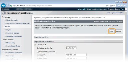 2 | Configurare le impostazioni DNS IPv6. La casella di controllo [Utilizzo IPv6] deve essere selezionata per configurare le impostazioni. Impostazione indirizzi IPv6 ![]() [Impostazioni DNS][Indirizzo server DNS primario] Digitare l'indirizzo IP di un server DNS. Non è possibile inserire un indirizzo che inizi con "ff" (o indirizzo multicast), l'indirizzo "0000::0000" (tutti zeri) o un indirizzo che inizi con "0:0:0:0:0:ffff" o "0:0:0:0:0:0". [Indirizzo server DNS secondario] Digitare l'indirizzo IP di un server DNS secondario. Non è possibile inserire un indirizzo che inizi con "ff" (o indirizzo multicast), l'indirizzo "0000::0000" (tutti zeri) o un indirizzo che inizi con "0:0:0:0:0:ffff" o "0:0:0:0:0:0". [Utilizzo nomi host/dominio IPv4] Selezionare la casella di controllo per utilizzare gli stessi nomi host e dominio utilizzati per IPv4. [Nome host] Immettere dei caratteri alfanumerici per il nome host della macchina da registrare sul server DNS. [Nome dominio] Immettere dei caratteri alfanumerici per il nome del dominio a cui appartiene la macchina, come "esempio.com". [Aggiornamento dinamico DNS] Selezionare la casella di controllo per aggiornare in modo dinamico i record DNS qualora cambi l'indirizzo IP della macchina. Per specificare i tipi di indirizzi da registrare nel server DNS, selezionare la casella di controllo per [Registra indirizzo manuale], [Registra indirizzo stateful] o [Registra indirizzo stateless]. [Impostazioni mDNS][Utilizzo mDNS] Adottato da Bonjour, mDNS (multicast DNS) è un protocollo per associare un nome host a un indirizzo IP senza utilizzare DNS. Selezionare la casella di controllo per attivare mDNS. Questa casella di controllo può essere selezionata solo quando la casella di controllo [Utilizzo IPv6] è selezionata. [Utilizzo stesso nome mDNS di IPv4] Selezionare la casella di controllo per utilizzare lo stesso nome mDNS impostato in IPv4. Per impostare un nome diverso, deselezionare la casella di controllo e immettere il nome mDNS nella casella di testo [Nome mDNS]. [Impostazioni opzione DHCP][Acquisisci indirizzo server DNS] Selezionare la casella di controllo per abilitare l'Opzione 23 e ottenere l'indirizzo del server DNS dal server DHCP. [Acquisisci nome dominio] Selezionare la casella di controllo per abilitare l'Opzione 24 e ottenere un nome di dominio dal server DHCP. |