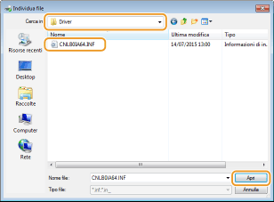4 | Specificare la cartella che contiene i driver aggiuntivi, selezionare il file INF e poi fare clic su [Apri]. ![]() Selezionare la cartella come mostrato qui sotto, in base al sistema operativo del server di stampa. Se il server di stampa ha un sistema operativo a 32 bit Selezionare la cartella [UFR II]-lingua-[x64]-[Driver] nel User Software CD-ROM/DVD-ROM. Se il server di stampa ha un sistema operativo a 64 bit Selezionare la cartella [UFR II]-lingua-[32BIT]-[Driver] nel User Software CD-ROM/DVD-ROM. | ||||||