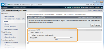 2 | Configurare le impostazioni in base alle esigenze. ![]() [Utilizzo Stampa RAW] Quando si usa RAW per stampare, selezionare la casella di controllo. Quando non si usa, deselezionare la casella di controllo. [Utilizzo comunicazione bidirezionale] Quando si usa la comunicazione bidirezionale per informare il computer dello stato della macchina e del completamento della stampa, selezionare la casella di controllo. Quando non si usa, deselezionare la casella di controllo. [Timeout RX] Impostare il periodo di tempo dopo il quale il processo di stampa termina automaticamente quando i dati di stampa non possono essere ricevuti a causa di un errore di comunicazione o qualche altro problema. |
