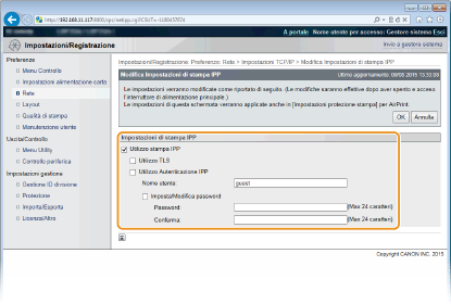 2 | Configurare le impostazioni in base alle esigenze. ![]() [Utilizzo stampa IPP] Quando si usa IPP/IPPS per stampare, selezionare la casella di controllo. Quando non si usa, deselezionare la casella di controllo. [Utilizzo TLS] Quando si usa IPPS (stampa IPP con comunicazione crittografata TLS), selezionare la casella di controllo. Quando non si usa, deselezionare la casella di controllo. ![]() Quando si usa IPPS, abilitare la funzione di comunicazione crittografata TLS. Utilizzo di TLS per le comunicazioni crittografate ![]() Se si seleziona [RSA] per [Algoritmo chiave] quando si genera la chiave da usare per le comunicazioni di rete, impostare una chiave lunga [1024 bit] o più. La stampa IPPS potrebbe non essere eseguita correttamente se viene impostata una chiave lunga [512 bit], a seconda del sistema operativo in uso. [Utilizzo Autenticazione IPP] Quando si usa la funzione di autenticazione utente per la stampa IPP, selezionare la casella di controllo e impostare nome utente e password. Quando non si usa, deselezionare la casella di controllo. [Nome utente] Immettere dei caratteri alfanumerici per il nome utente usato nell'autenticazione IPP. [Imposta/Modifica password] Per impostare o modificare la password, selezionare la casella di controllo e immettere dei caratteri alfanumerici per la password nella casella di testo [Password]. Per confermare, digitare la stessa password nella casella di testo [Conferma]. |