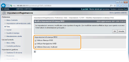 2 | Configurare le impostazioni in base alle esigenze. ![]() [Utilizzo Stampa WSD] Quando si usa WSD per stampare, selezionare la casella di controllo. Quando non si usa, deselezionare la casella di controllo. [Utilizzo Navigazione WSD] Selezionare la casella di controllo per ottenere informazioni sulla macchina da un computer tramite WSD. La casella di controllo viene selezionata automaticamente quando la casella di controllo [Utilizzo Stampa WSD] è selezionata. [Utilizzo Discovery multicast] Selezionare la casella di controllo per impostare la macchina per la risposta a messaggi di rilevamento multicast. Quando la casella di controllo è deselezionata, la macchina rimane in modalità di riposo anche se sulla rete è presente un flusso di messaggi di rilevamento multicast. |