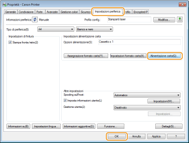 Normalmente, è necessario specificare il formato e il tipo di carta caricata in ciascuna alimentazione prima di procedere alla stampa.