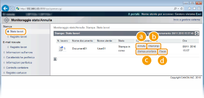 È possibile verificare lo stato della stampa (in fase di stampa o in attesa di stampa) dei documenti inviati da un computer per essere stampati, nonché eliminare o interrompere dei documenti.