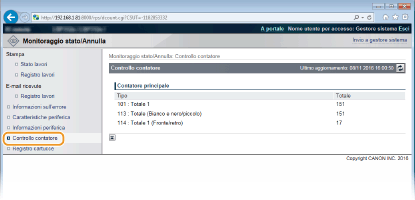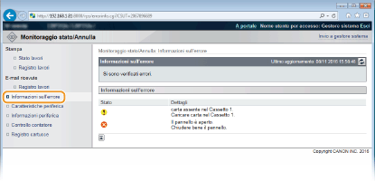 Se si verifica un errore, viene visualizzata questa pagina facendo clic sul messaggio visualizzato in [Informazioni sull'errore] nella Pagina portale (pagina principale).