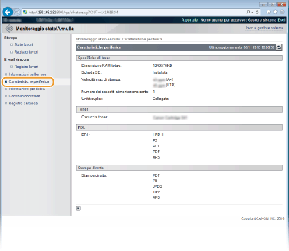 È possibile visualizzare le informazioni sulla macchina, comprese la velocità di stampa massima e le funzioni.