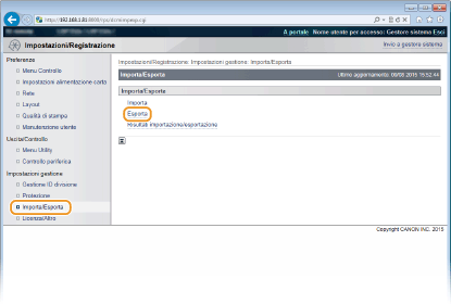 È possibile esportare le impostazioni della macchina e salvarli su un computer. È consigliabile effettuare regolarmente una copia di backup delle impostazioni importanti.