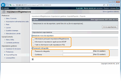 Per esportare i dati delle impostazioni delle voci di menu che possono essere impostate da [Impostazioni/Registrazione] nella pagina del portale, selezionare le caselle di controllo per tali voci.