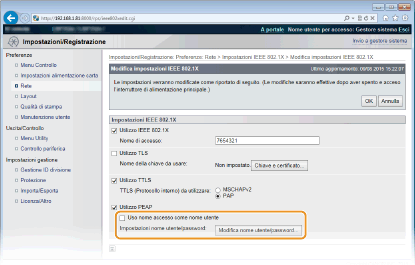 Selezionare la casella di controllo [Utilizzo IEEE 802.1X], immettere il nome di accesso nella casella di testo [Nome di accesso] e specificare le impostazioni richieste.
