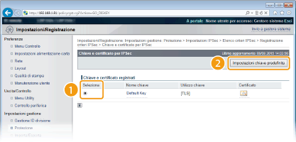 2 | Selezionare la coppia di chiavi da usare e fare clic su [Impostazioni chiave predefinita]. Visualizzazione dei dettagli di una coppia di chiavi o di un certificato |