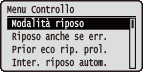 ![]() | Le impostazioni relative alla modalità riposo e al modo in cui la macchina deve comportarsi in caso di errore vengono elencate con brevi descrizioni. Le impostazioni predefinite sono contrassegnate da una croce ( ). |
