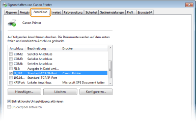 Vergewissern Sie sich auf der Registerkarte [Anschlüsse], dass der Anschluss (Port) korrekt ausgewählt ist.