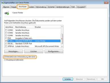 Stellen Sie sicher, dass auf der Registerkarte [Anschlüsse] das Kontrollkästchen [Bidirektionale Unterstützung aktivieren] aktiviert ist.