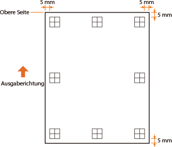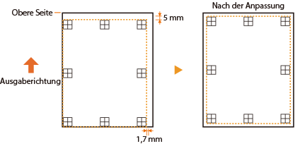 gedruckt. Bestimmen Sie die Richtung und den anzupassenden Abstand basierend auf diesen Markierungen. Wenn die Druckposition bestimmungsgemäß ist, werden sämtliche Markierungen in einer Position 5 mm ab dem nächstgelegenen Rand des Papiers gedruckt.
