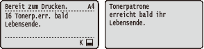 Diese Meldung weist Sie darauf hin, dass eine Tonerpatrone demnächst ausgetauscht werden muss. Halten Sie die entsprechende Ersatzpatrone bereit. Tauschen Sie die Tonerpatrone aus, wenn die Meldung erscheint und Sie einen umfangreichen Druckauftrag starten wollen.