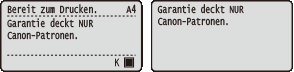 Sie können mit dem Drucken fortfahren, wenn diese Meldung eingeblendet wird, aber die Druckqualität ist eventuell verringert. Andernfalls kann es zu Schäden am Gerät kommen. |