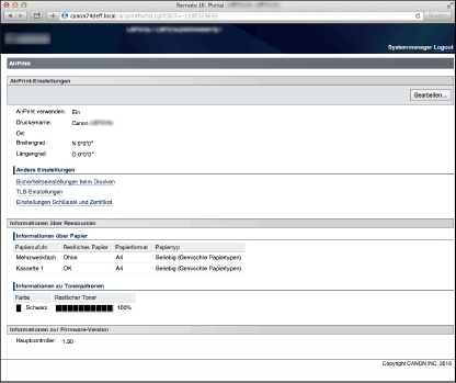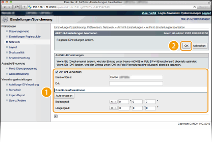 Sie können Informationen, mit denen das Gerät identifiziert wird, beispielsweise den Namen des Geräts und den Aufstellort, speichern. Sie können die AirPrint-Funktion des Geräts auch deaktivieren. Ändern Sie diese Einstellungen mit Remote UI.