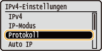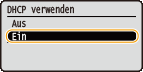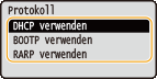 3 | Wählen Sie <DHCP verwenden>, <BOOTP verwenden> oder <RARP verwenden> aus, und drücken Sie . Sie können nur eines der Protokolle DHCP, BOOTP und RARP verwenden. Wenn das ausgewählte Protokoll auf <Ein> gesetzt wird, werden die anderen beiden Protokolle automatisch auf <Aus> gesetzt. |