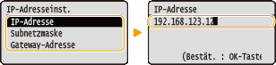 3 | Geben Sie die IP-Adresse, die Subnetmaske und die Gateway-Adresse (oder den Standard-Gateway) ein. Wählen Sie die einzustellende Option, drücken Sie  , geben Sie eine Adresse ein, und drücken Sie  . So geben Sie Adressen ein Mit den  /  gelangen Sie zum Zielfeld (einem periodenbegrenzten Eingabebereich) und mit den Zahlentasten erhöhen/senken Sie den Wert. Wenn Sie sich über die einzugebende IP-Adresse unsicher sind |