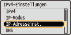 2 | Wählen Sie <IP-Adresseinst.>, und drücken Sie . |
