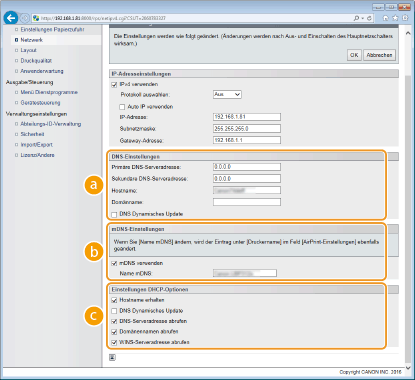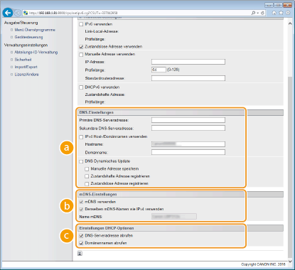 2 | Konfigurieren Sie die IPv4-DNS-Einstellungen. ![]() [DNS-Einstellungen][Primäre DNS-Serveradresse] Geben Sie die IP-Adresse eines DNS-Servers ein. Sie können ebenfalls die IP-Adresse vom Bedienfeld (IPv4-Einstellungen) festlegen. [Sekundäre DNS-Serveradresse] Geben Sie die IP-Adresse eines sekundären DNS-Servers ein. Sie können ebenfalls die IP-Adresse vom Bedienfeld (IPv4-Einstellungen) festlegen. [Hostname] Geben Sie alphanumerische Zeichen für den Hostnamen des Geräts ein, der beim DNS-Server registriert werden soll. [Domänname] Geben Sie alphanumerische Zeichen für den Namen der Domäne ein, zu der das Gerät gehört, wie beispielsweise "beispiel.de." [DNS Dynamisches Update] Aktivieren Sie das Kontrollkästchen, wenn die DNS-Datensätze dynamisch aktualisiert werden sollen, sobald sich die IP-Adresse des Geräts ändert. [mDNS-Einstellungen][mDNS verwenden] Das von Bonjour implementierte mDNS (Multicast-DNS) ist ein Protokoll für die Zuordnung von Hostnamen zu IP-Adressen ohne Verwendung von DNS. Aktivieren Sie das Kontrollkästchen, um mDNS zu aktivieren, und geben Sie den mDNS-Namen in das Textfeld [Name mDNS] ein. Dieses Kontrollkästchen kann nur aktiviert werden, wenn das Kontrollkästchen [IPv4 verwenden] aktiviert ist. [Einstellungen DHCP-Optionen][Hostname erhalten] Aktivieren Sie das Kontrollkästchen, um die Option 12 zu aktivieren, sodass Sie den Hostnamen vom DHCP-Server abrufen können. Sie können ebenfalls festlegen, ob Sie einen Hostnamen über das Bedienfeld (IPv4-Einstellungen) abrufen. [DNS Dynamisches Update] Aktivieren Sie das Kontrollkästchen, um die Option 81 zu aktivieren, sodass die DNS-Datensätze über den DHCP-Server dynamisch aktualisiert werden. Sie können ebenfalls festlegen, ob die dynamische Aktualisierung über das Bedienfeld (IPv4-Einstellungen) ausgeführt werden soll. [DNS-Serveradresse abrufen] Aktivieren Sie das Kontrollkästchen, um Option 6 zu aktivieren und eine DNS-Serveradresse vom DHCP-Server abzurufen. [Domänennamen abrufen] Aktivieren Sie das Kontrollkästchen, um Option 15 zu aktivieren und einen Domänennamen vom DHCP-Server abzurufen. [WINS-Serveradresse abrufen] Aktivieren Sie das Kontrollkästchen, um Option 44 zu aktivieren und eine WINS-Serveradresse vom DHCP-Server abzurufen. |