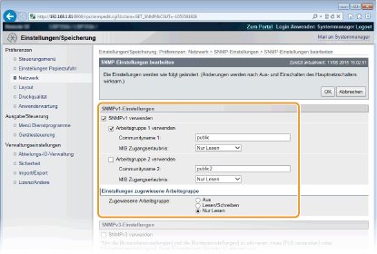 Deaktivieren von SNMPv1Wenn SNMPv1 deaktiviert ist, stehen einige der Funktionen des Geräts nicht mehr zur Verfügung, so auch das Abrufen von Geräteinformationen über den Druckertreiber. Verwenden des BedienfeldsSie können im Einstellungsmenü des Bedienfelds ebenfalls auf die SNMP-Einstellungen zugreifen. SNMP-Einstellungen |