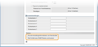 Wenn Sie das Kontrollkästchen aktivieren, werden Anwendungen, die das SNMP-Protokoll verwenden, wie zum Beispiel Canon Software imageWARE Series, für den Zugriff auf das Gerät deaktiviert.