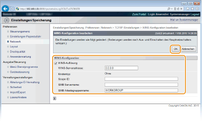 Wenn Sie das Gerät im WINS-Server registrieren, können Sie den Namen der Arbeitsgruppe, zu der das Gerät im SMB-Netzwerk gehört, festlegen.