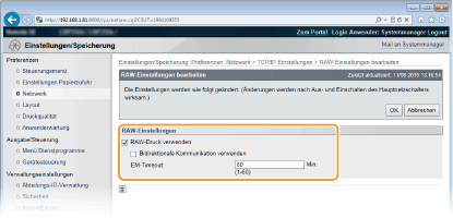 2 | Konfigurieren Sie die Einstellungen nach Bedarf. ![]() [LPD-Druck verwenden] Aktivieren Sie das Kontrollkästchen, wenn Sie LPD zum Drucken verwenden wollen. Wenn Sie LPD nicht verwenden, deaktivieren Sie das Kontrollkästchen. [LPD-Testseite drucken] Aktivieren Sie das Kontrollkästchen, um Informationen aufzunehmen, wie zum Beispiel Benutzernamen und Dateinamen auf Druckausgaben. Wenn Sie die Informationen nicht drucken, deaktivieren Sie das Kontrollkästchen. [EM-Timeout] Stellen Sie den Zeitraum ein, nach dem der Druckauftrag automatisch beendet wird, wenn Druckdaten aufgrund eines Kommunikationsfehlers oder eines anderen Problems nicht empfangen werden können. |