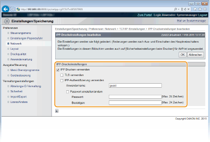 2 | Konfigurieren Sie die Einstellungen nach Bedarf. ![]() [IPP Drucken verwenden] Aktivieren Sie das Kontrollkästchen, wenn Sie IPP/IPPS zum Drucken verwenden. Wenn Sie IPP/IPPS nicht verwenden, deaktivieren Sie das Kontrollkästchen. [TLS verwenden] Aktivieren Sie das Kontrollkästchen, wenn Sie IPPS (IPP-Druck mit verschlüsselter TLS-Kommunikation) zum Drucken verwenden. Wenn Sie IPPS nicht verwenden, deaktivieren Sie das Kontrollkästchen. ![]() Wenn Sie IPPS verwenden, dann aktivieren Sie die Funktion verschlüsselte TLS-Kommunikation. Verwenden von TLS für verschlüsselte Kommunikationen ![]() Wenn Sie bei der Generierung des Schlüssels [RSA] für [Schlüsselalgorithmus] auswählen, stellen Sie eine Schlüssellänge von [1024-Bit] oder länger ein. Das Drucken über IPPS wird eventuell nicht korrekt ausgeführt, wenn Sie je nach verwendetem Betriebssystem eine Schlüssellänge von [512-Bit] einstellen. [IPP-Authentifizierung verwenden] Aktivieren Sie das Kontrollkästchen und legen Sie Benutzername und Passwort fest, wenn Sie die Benutzerauthentisierungsfunktion für den IPP-Druck verwenden. Wenn Sie diese Option nicht verwenden, deaktivieren Sie das Kontrollkästchen. [Anwendername] Geben Sie alphanumerische Zeichen für den bei der IPP-Authentisierung verwendeten Benutzernamen ein. [Passwort einstellen/ändern] Zum Festlegen oder Ändern des Passworts aktivieren Sie das Kontrollkästchen und geben Sie alphanumerische Zeichen für das Passwort in das Textfeld [Passwort] ein. Geben Sie zur Bestätigung dasselbe Passwort in das Textfeld [Bestätigen] ein. |