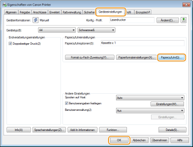 Wenn die optionale Papierzufuhr am Gerät installiert ist, führen Sie im Druckertreiber folgende Schritte aus.