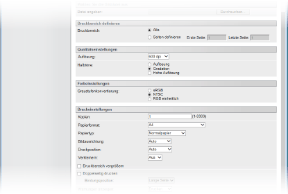 [Auflösung][1200 dpi] | Kanten von Zeichen und Grafiken können bei hoher Auflösung deutlich wiedergegeben werden. Dieser Druckmodus ist geeignet für Druckdaten, die viele kleine Zeichen enthalten. |