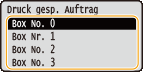 [Mailboxen]Ein Ort, der zur Speicherung der Druckdaten auf der SD-Karte dient, wird als Mailbox bezeichnet. Wählen Sie die Nummer der Mailbox, um das Dokument zu speichern. Sie können der Mailbox einen Namen zuweisen, um die Identifikation der Mailbox zu vereinfachen.