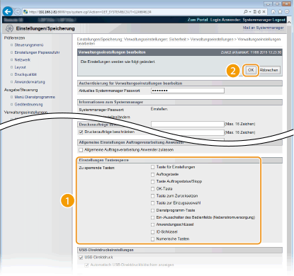 Sie können die Verwendung der Tasten am Bedienfeld einschränken, um zu verhindern, dass die Einstellungen des Geräts leichtfertig geändert werden.