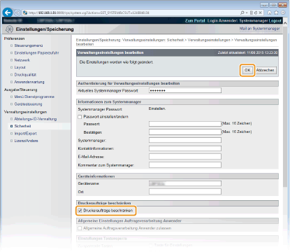 Aktivieren Sie das Kontrollkästchen [Druckeraufträge beschränken], und klicken Sie auf [OK].