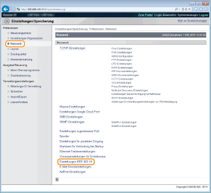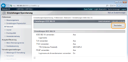 Verwenden des BedienfeldsSie können ebenfalls die IEEE 802.1X-Authentisierung im Einstellungsmenü des Bedienfelds aktivieren oder deaktivieren. IEEE802.1X |