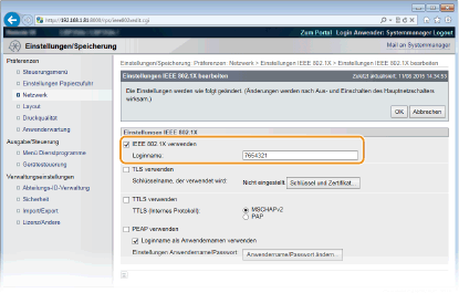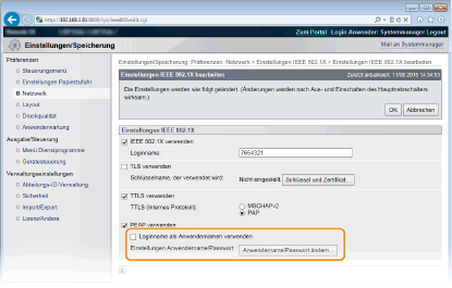Aktivieren Sie das Kontrollkästchen [IEEE 802.1X verwenden], geben Sie den Login-Namen in das Textfeld [Loginname] ein, und legen Sie die erforderlichen Einstellungen fest.