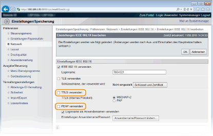 Hierbei sind fast die gleichen Einstellungen wie für TTLS erforderlich. Als internes Protokoll wird MS-CHAPv2 verwendet. Aktivieren Sie TLS für Remote UI, bevor Sie diese Authentisierungsmethode konfigurieren (