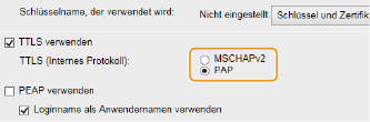 1 | Aktivieren Sie das Kontrollkästchen [TTLS verwenden] oder [PEAP verwenden]. Internes Protokoll für TTLS Sie können MSCHAPv2 oder PAP wählen. Wenn Sie PAP verwenden wollen, klicken Sie auf das Optionsfeld [PAP]. |