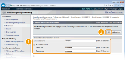 3 | Stellen Sie den Anwendernamen und das Passwort ein, und klicken Sie auf [OK]. [Anwendername] Geben Sie alphanumerische Zeichen für den Benutzernamen ein. [Passwort ändern] Zum Festlegen oder Ändern des Passworts aktivieren Sie das Kontrollkästchen, und geben Sie alphanumerische Zeichen für das neue Passwort in die Textfelder [Passwort] und [Bestätigen] ein. |