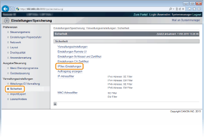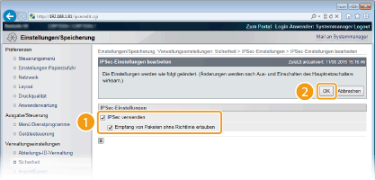 Verwenden des BedienfeldsSie können ebenfalls die IPSec-Kommunikation im Einstellungsmenü des Bedienfelds aktivieren oder deaktivieren. IPSec |